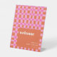 This baby shower welcome sign features a playful pink and orange checkerboard pattern paired with a warm coral accent and clean serif typography. The bold, modern layout makes a cheerful first impression while clearly marking the celebration space. Designed to coordinate beautifully with colorful and contemporary baby shower themes. Personalize the name and date to create a cohesive, inviting detail guests will notice as they arrive.