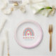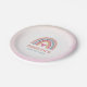 This adorable first birthday party paper plate is a fun personalised addition to any girl's celebration. This design features a cute abstract rainbow in pink, teal, gold and is accented with a pink heart.