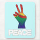An abstract painting of the peace sign hand using colours of the rainbow, with a colourful outline of the word peace, by CherylsArt, is printed on custom mousepads. I had fun using my own hand to create this design.
