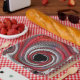 This product features beautiful spiral fractal art in red, black, grey and white.