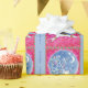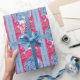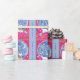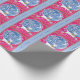The abstract retro image on this Christmas gift wrap paper is unique. It features a pretty silver reindeer dressed in green and red, and with a variety of colourful Holiday bulbs dangling from its huge antlers. The deer prances before a blue circular night sky complete with crescent moon and stars. The image is placed on a bright pink background bordered in matching blue. The text "Merry Christmas!" is in the blue border.
