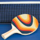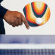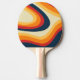Abstract retro style waves geometrical pattern illustration with red, orange, yellow and beige striped waves decoration on dark blue background.