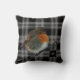 Modern pillow with abstract Robin bird photo art on black white buffalo plaid.
