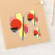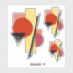 A black triangle divided into segments, a black trapezoidal band divided into two, a red circle, a yellow rectangle, a pale red square, a purplish circle, and an orange square feature in this abstract art of overlapping shapes by Richard H. Fay.
