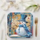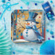 The abstract elements of the image create a whimsical and imaginative winter scene. The snowman, with its top hat and blue scarf, stands out with its colourful buttons, adding a playful touch. Spherical ornaments contribute to the festive atmosphere, while their shapes and colours blend into the background in a surreal manner.