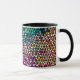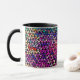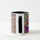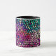My original digital art on this mug features a pattern of abstract shapes against a black background for a stained-glass art style. The inside of the mug and the handle are in a black tone to complement the artwork. The colours and pattern have a vintage vibe for a classic touch.