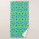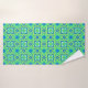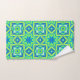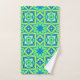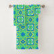 Towel set in a geometric abstract star pattern In shades of lime green, cerulean blue and turquoise, accented with deep blue