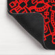 A mouse pad with an quirky hand drawn abstract surreal design, a network of shapes link together with wire like shapes which looks both natural and machine like.