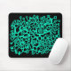 A mouse pad with an quirky hand drawn abstract surreal design, a network of shapes link together with wire like shapes which looks both natural and machine like.