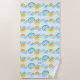 Abstract sky scene with clouds and sunshine shining through beach towel. This lovely design conveys a peaceful and cheerful scene, reminiscent of sunny skies with floating clouds. Abstract clouds are curved, semi-circular lines in varying shades of blue, while the suns are placed within the curves of the clouds, creating the impression of a sunrise or sunset. The colours used are soft and harmonious, combining cool blues for the clouds with warm yellows and oranges for the sun, evoking a serene and balanced atmosphere. Designed abstract nature allows for a modern and stylish interpretation of a natural landscape.