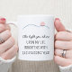 Abstract Sun Logo Motivational Quote Coffee Mug... The motivational saying on our custom coffee mug reads "The light you shine upon my life brightens with each passing year" in trendy script and classic sans serif typography. A simple line art illustration of a dusty pink sun over teal rolling hills reinforces the message of light. Add your name and the name of your significant other via the personalisation template. Makes a thoughtful holiday gift, birthday present, or Valentine's Day gift. Original quote by Barbara Casey.