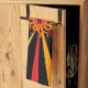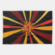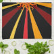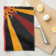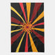 This kitchen towel features a wild abstract geometric pattern of the sun and it's rays in colours of red, yellow, gold, orange and brown set on a pure black background.