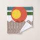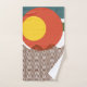 This towel set has a mid-century modern design of horizontal wavy lines with two circles and two horizontal broad stripes. Want different colours? Message me.