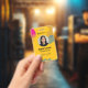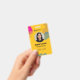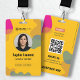This vibrant and modern employee ID badge features a striking yellow background adorned with abstract, flowing shapes in pink, olive green, and grey. Designed for professionalism with a touch of artistic flair, it's perfect for any organization looking to make a memorable impression. The layout includes ample space for a photo, name, title, and ID number, ensuring essential information is clearly visible. On the reverse, a dedicated section for validity dates and a QR code provides easy access to digital information and contact details, including email and address. Elevate your company's identification with this uniquely designed and functional badge.