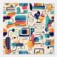 This vibrant abstract artwork combines geometric shapes and technology-inspired icons in a dynamic, retro-futuristic colour scheme. The bold use of teal, orange, and navy blue creates a lively composition reminiscent of data systems, modern interfaces, and tech schematics. Perfect for adding an energetic, contemporary touch to any space, this digital design reflects the aesthetics of connectivity and innovation with a playful, artistic twist.