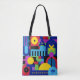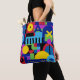 Bright colours and bold shapes evoke familiar motifs—see street signs, railroad ties, and the letters U-T-A scattered throughout this fun abstract design.