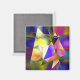 Bold and vivid lines criss cross and intersect each other forming colourful abstract triangles with purple, pink, orange, yellow and green predominating.