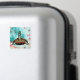 A hand drawn depiction of a turtle with an abstract background. Colours used: red, blue, teal, green, yellow, purple.