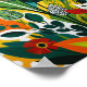 A vibrant and abstract painting featuring a variety of stylised abstract shapes. The artwork is filled with bold, saturated colours, including shades of dark green, orange, yellow, green, and blue. The shapes have large, exaggerated petals with intricate patterns, while the strips are depicted in a variety of shapes and sizes, creating a lush, layered effect. The background includes a mix of solid colours, gradient washes, and playful polka dots, adding depth and contrast. The overall style is modern, expressive, and full of energy, with a strong emphasis on colour and form, flat vector art, graffiti, acrylic watercolor, white dragonfly, flat stamp effect collage. red hues, paisley pattern, white cat in the corner
