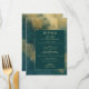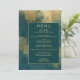 This elegant wedding menu features a modern teal blue and gold abstract watercolor background. Customise the gold-coloured text in stylish fonts on a dark teal rectangle. The back of the menu repeats the abstract design.