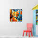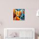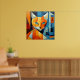 What sets this artwork apart are the mesmerising blue eyes of the cat, capturing the essence of its gaze in a truly unique way. The meticulous inclusion of white whiskers adds a delicate touch, highlighting the intricate details in the midst of abstract beauty. The contrast between the warm orange tones of the cat and the cool blues and greys of the background creates a visually arresting composition.