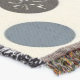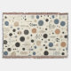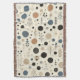 An elegant pattern featuring various circles and botanical motifs in a soothing palette of beige, brown, black, and blue. This minimalist design evokes a serene woodland atmosphere.