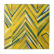 This striking ceramic tile features a bold, abstract chevron pattern in shades of yellow, white, and teal.
