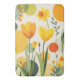 Bold yellow and orange daffodils and tulips bloom on this design, in a style reminiscent of mid century modern.