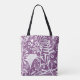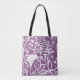 A modern botanical pattern of white leaves, flowers and foliage silhouetted on a purple berry background.