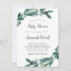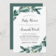 Elegant botanical baby shower invitations feature a chic colour palette of forest green, inky off-black and crisp white. Your baby shower details are draped with abundant green branches and leaves in a vibrant painted watercolor style.