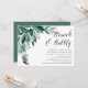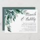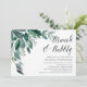 Chic bridal shower brunch invitation features lush green eucalyptus leaves and foliage, illustrated in watercolor. Personalise with your bridal brunch details aligned at the right, topped with "brunch & bubbly" in elegant calligraphy script. Cards reverse to solid forest green.