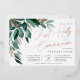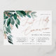 Elegant first holy communion invitation for your little girl features watercolor eucalyptus leaves and green foliage cascading from the upper left corner, embellished with rose gold foil accents. Personalise with your Communion ceremony and celebration details aligned at the right. Cards reverse to solid forest green.