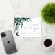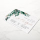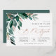 Elegant gender neutral b mitzvah invitation features watercolor eucalyptus leaves and green foliage cascading from the upper left corner, embellished with rose gold foil accents. Personalise with your temple ceremony and celebration details aligned at the right. Cards reverse to solid forest green.