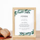 Charming wedding menu sign displays your dinner selections in chic calligraphy and traditional block lettering. Adorned with watercolor botanical greenery and eucalyptus leaves that match our Abundant Foliage wedding collection.
