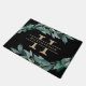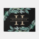 Elegant botanical doormat in rich black features your single initial monogram with your family name overlaid, framed by watercolor leaves and foliage in rich shades of green.