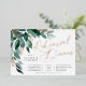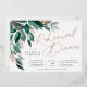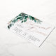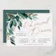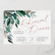 Elegant wedding rehearsal dinner features watercolor eucalyptus leaves and green foliage cascading from the upper left corner, embellished with rose gold foil accents. Personalise with your ceremony rehearsal and celebration details aligned at the right. Cards reverse to solid forest green.