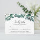 Elegant botanical RSVP card features green watercolor eucalyptus leaves and foliage with inky off-black calligraphy and block lettering. Personalise with your desired RSVP date as well as custom accept and decline wording. Includes space for guests to indicate their choice of entree or meal ahead of time. Designed to match our Abundant Foliage invitation collection.