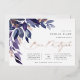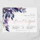 Elegant gender neutral bar mitzvah invitation features blue and purple watercolor leaves and foliage cascading from the upper left corner, embellished with rose gold foil accents. Personalise with your temple ceremony and celebration details aligned at the right.