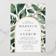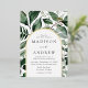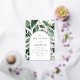 Elegant wedding invitations featuring your wedding details nestled inside of an arched gold foil frame surrounded by eucalyptus, ferns, and other rich greenery. The botanical arch wedding invitations reverse to a solid dark green background. Designed to coordinate with our Abundant Greenery wedding collection.