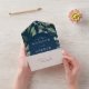 Modern, botanical all-in-one wedding invitations featuring your wedding details nestled inside of an arched frame surrounded by eucalyptus, ferns, and other rich greenery with a navy background. Personalise the watercolor greenery all-in-one wedding invitation with wedding details such as your names, wedding date, venue information, response date, meal choices, etc. Designed to coordinate with our Abundant Greenery wedding collection.