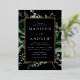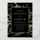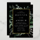 Elegant wedding invitations featuring your wedding details nestled inside of a rectangular gold foil frame surrounded by eucalyptus, ferns, and other rich greenery with a black background. The modern botanical wedding invitations reverse to a solid black background. Designed to coordinate with our Abundant Greenery wedding collection.