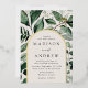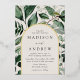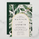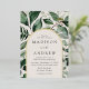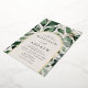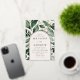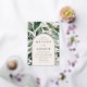 Elegant wedding invitations featuring your wedding details nestled inside of an arched cream and gold foil frame surrounded by eucalyptus, ferns, and other rich greenery. The botanical arch wedding invitations reverse to a solid dark green background. Designed to coordinate with our Abundant Greenery wedding collection.