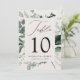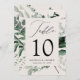 Elegant, botanical wedding table cards featuring the table number, your names, and wedding date nestled in a rectangular frame surrounded by eucalyptus, ferns, and other rich greenery with a cream background. Personalise the number for each table card and add it to your cart. The 5x7 table cards were designed to coordinate with our Abundant Greenery wedding collection.