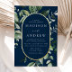 Elegant wedding invitations featuring your wedding details nestled inside of a gold foil oval frame surrounded by eucalyptus, ferns, and other rich greenery with a navy blue background. The modern botanical wedding invitations reverse to a solid navy background. Designed to coordinate with our Abundant Greenery wedding collection.