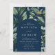 Elegant wedding invitations featuring your wedding details nestled inside an arched frame surrounded by eucalyptus, ferns, and lush greenery against a deep navy background. The botanical arch design reverses to a coordinating solid navy back, offering a refined and cohesive look. Part of our Abundant Greenery wedding collection, these invitations are perfect for garden, woodland, or elegant evening celebrations.