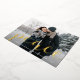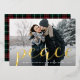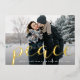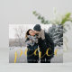 Simple and elegant holiday photo card lets your favourite photo take centre stage. Chic design features a full bleed horizontal or landscape orientated photo, with "peace" overlaid in gold foil script lettering. Personalise with your names or family name, and the year. Cards reverse to a wintry red and green tartan plaid pattern.