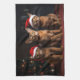 An enchanting scene captures the essence of cosiness and holiday spirit as furry companions adorned in Santa Claus hats gather around a crackling fireplace. The warmth emanating from the hearth creates a snug atmosphere for these adorable canines, while festive stockings hang in the background, enhancing the merry ambiance. The charming illustration portrays a timeless image of companionship and festive joy, perfect for celebrating the holiday season with a touch of canine charm
