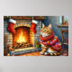 Abyssinian Cat Sitting by Fireplace with Christmas Poster