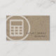 This accountant business card features a big bold translucent white icon of a calculator. The background is a natural light brown paper texture, with your name and title appearing on the lower right side of the card. The overall design is minimalist, perfect for administration, accounting, finance, marketing, professional themes.