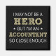I may not be a hero, but I'm an Accountant so close enough humourous word art in sans-serif and doodle cross-hatch font lettering in white and golden yellow.